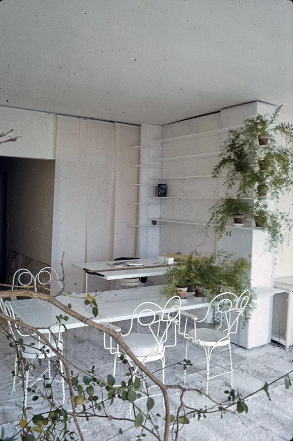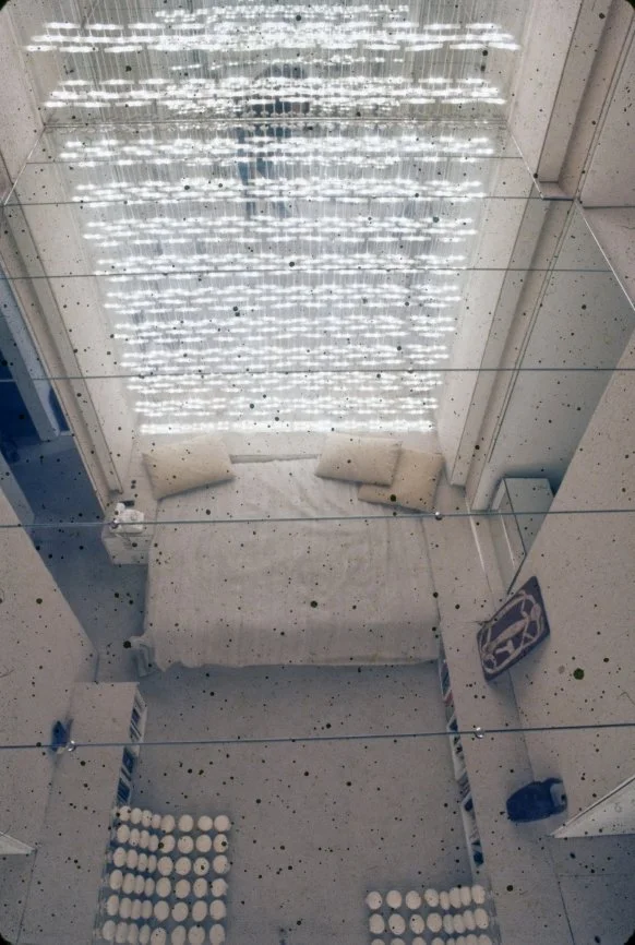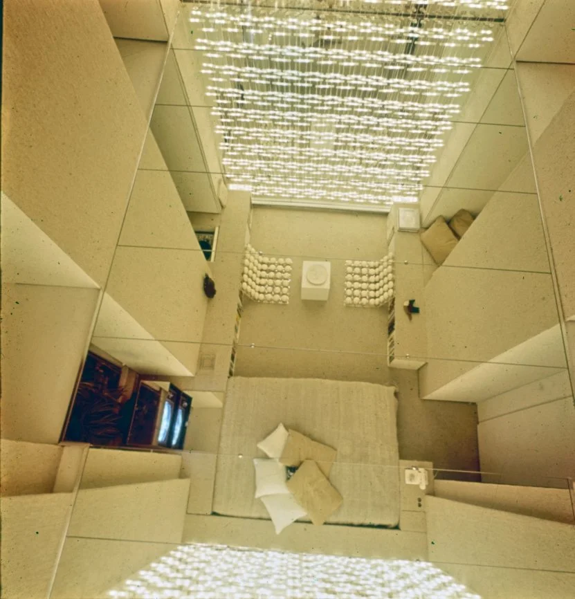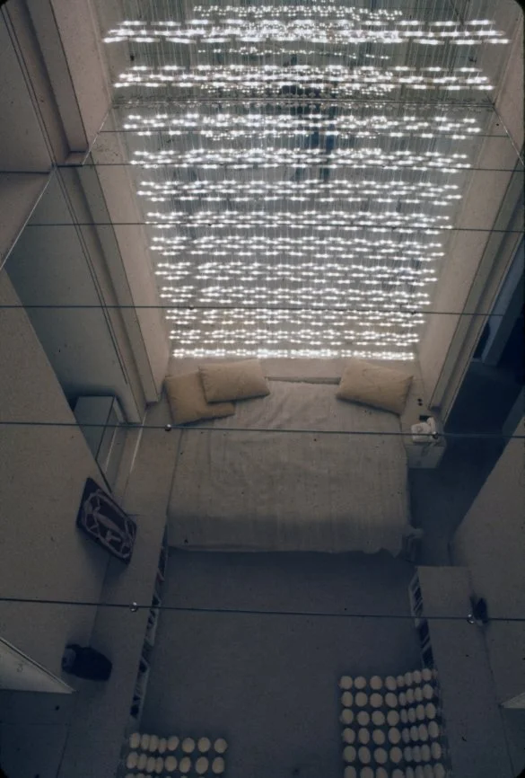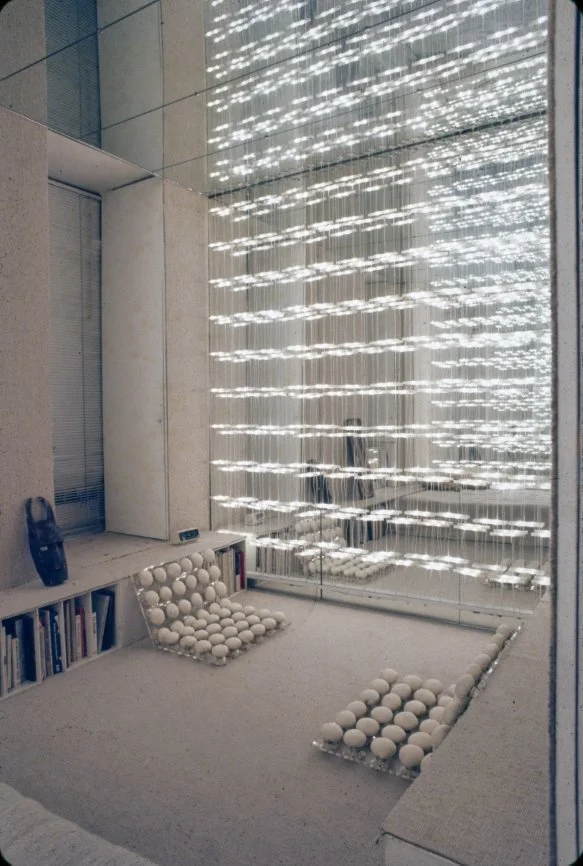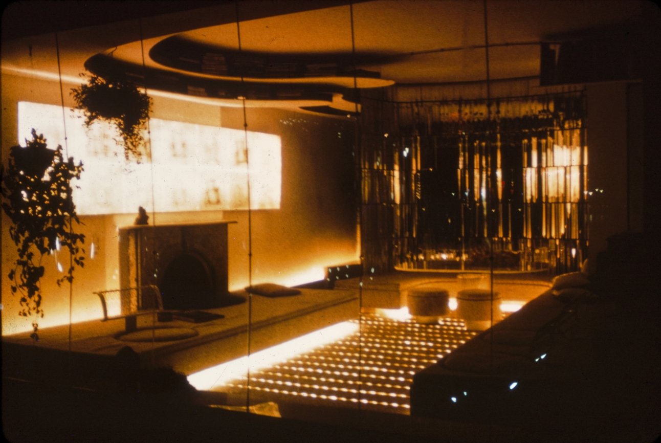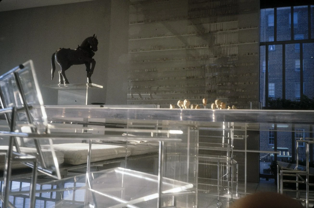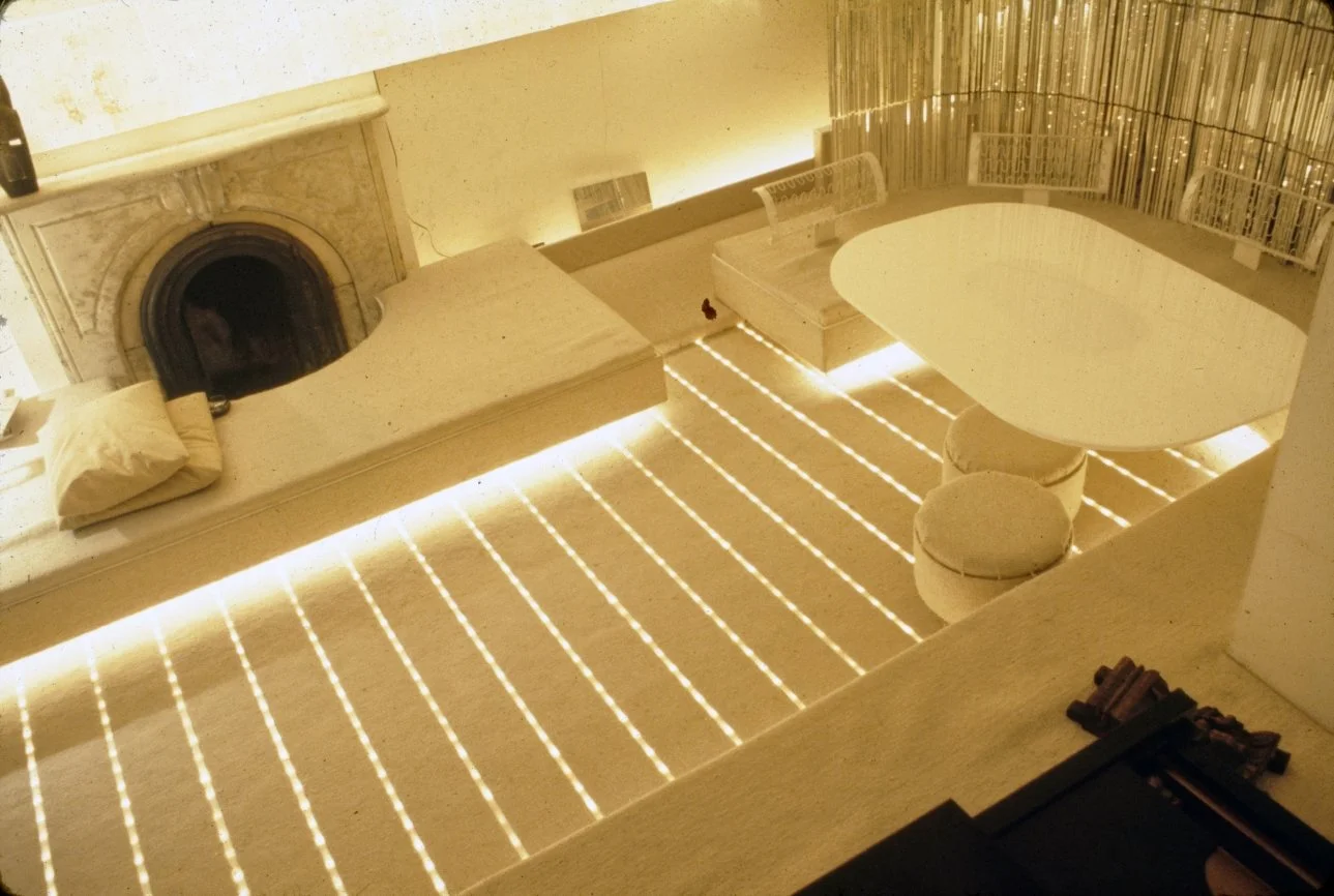 Rudolph’s first alteration of the apartment’s design includes plastic as a material for a table, built-in platforms, sliding panels and a sculpture to unify the space. The only free-standing seating is provided by white ice cream parlor chairs (Rudolph says, “They de-materialize - space goes right through them.”). To make the low-ceilinged rooms appear larger, Rudolph covers almost every surface in white, using texture rather than color to provide variety. Where there is color, it comes from segments of commercial billboard advertisements used as wallpaper (Rudolph says, “This is how you can afford great gobs of color without the expense of paintings, and each week you can afford a new one.”) He also provides opportunity to change the lighting in the apartment by putting all of the lights on separate dimmer switches “to create different psychological moods,” according to Rudolph. In the corridor leading to the bedroom from the living room which is too narrow for conventional bookshelves, Rudolph mounts his books on the wall like paintings by securing them to the wall with three L-screws. (“Now I remember books I didn’t know I had and I pick up books I’d forgotten about just because they are more visible.”) In the bedroom, the bed is covered with white sheepskin and sits on a white sheepskin rug. One wall of the bedroom is mirrored to give the small room a sense of being a larger space. Seven closets and an air conditioner are hidden behind a curtain of amber plastic beads glued to fishing line that is suspended from a track at the ceiling. A small television, unused, sits in a frame meant for a Josef Albers print. Above the bed (and reflected in the mirrored wall opposite) is a billboard advertisement for a man’s deodorant which fills the entire wall. In the living room, Rudolph uses a Plexiglas platform as seating, lighting and as a room divider. The platform is lit underneath by incandescent lights on a dimmer switch so that it appears to float above the floor. Plaster panels made from a rubber mold of a Louis Sullivan tile salvaged from the Garrick Theater (demolished in 1961) rest on steel back supports at the back of the seating platform. (The whole business of lots of legs and the usual 20th-century furniture is alien to architecture,” Rudolph says.) Curtains made of mirrors glued to fishing line are strung from a track above the window overlooking the East River. A rug of white kidskin covers the floor. A white plastic sculpture by William Ryman stands in the corner of the room. A billboard advertisement for a beverage is placed on the wall above the fireplace.