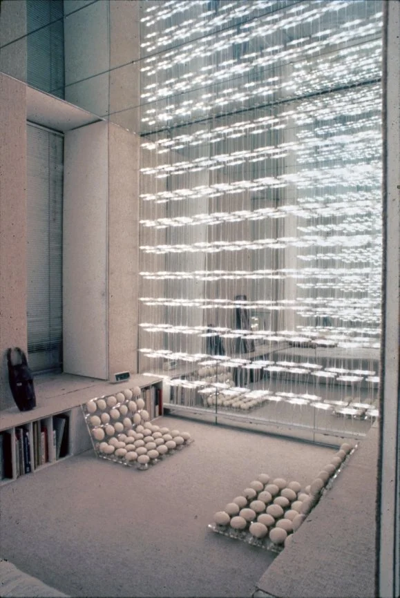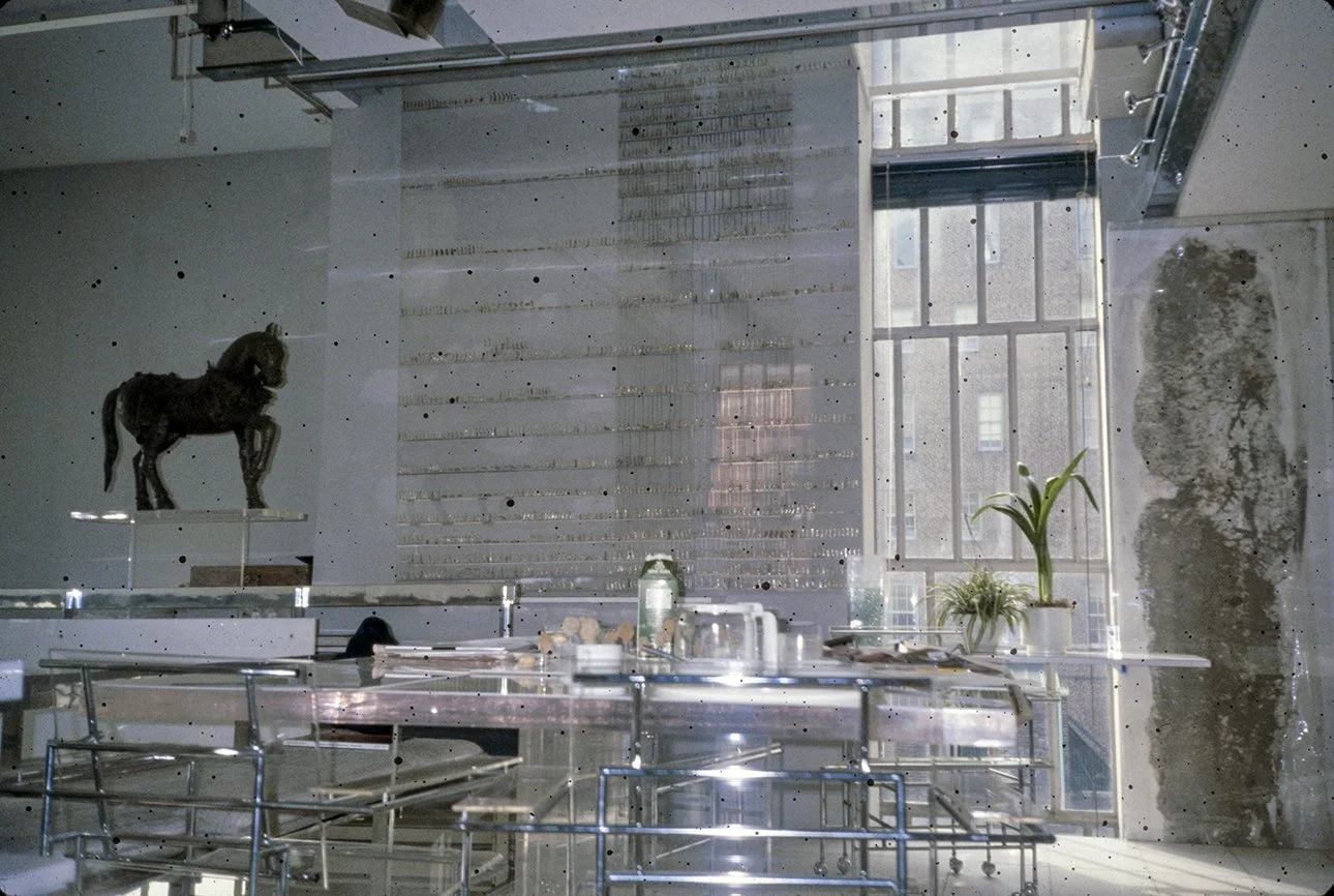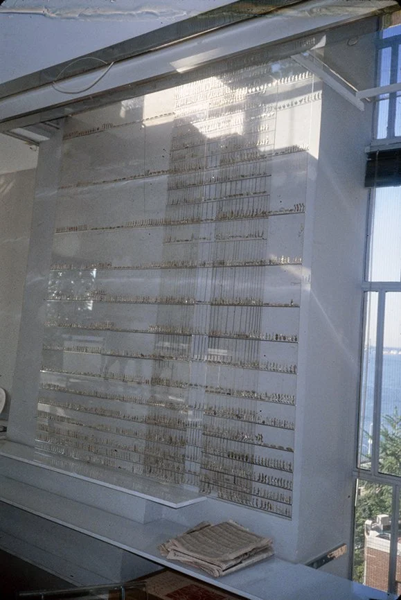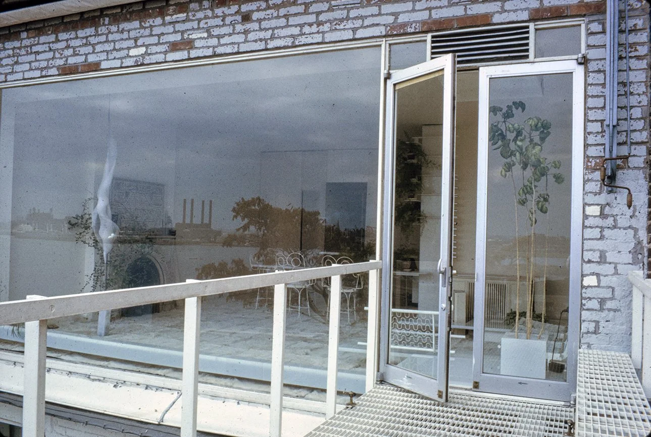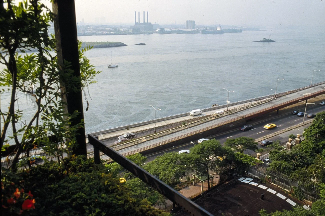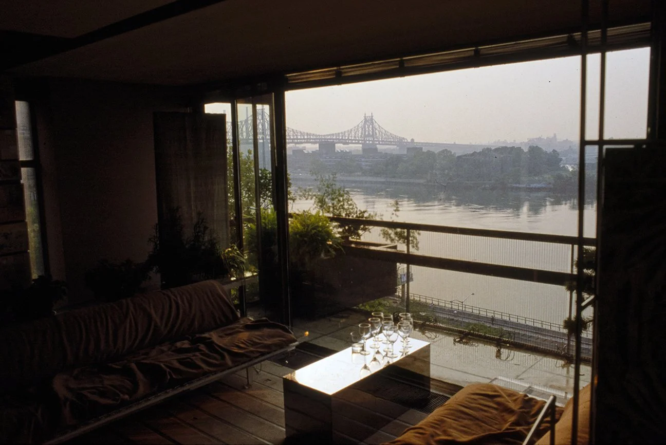 “For approximately 15 years I have occupied an 800 square foot apartment overlooking the East River. During this period its constrictions were modified in various ways. Three small windows facing the river, Roosevelt Island, and industrial Queens (complete with its 40’ x 90’ neon signs) were replaced by a glass wall with doors opening onto a small terrace. ”