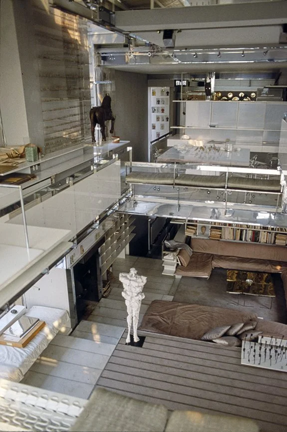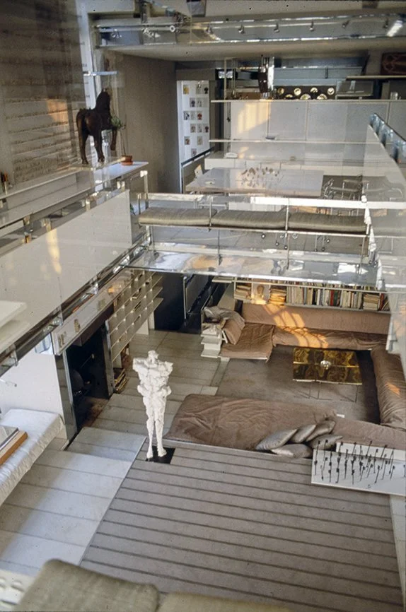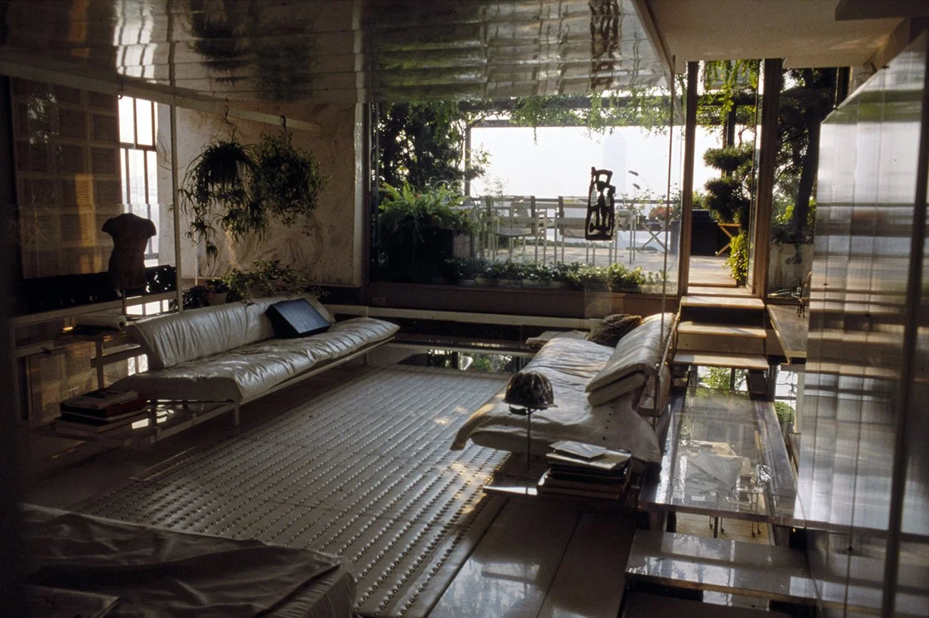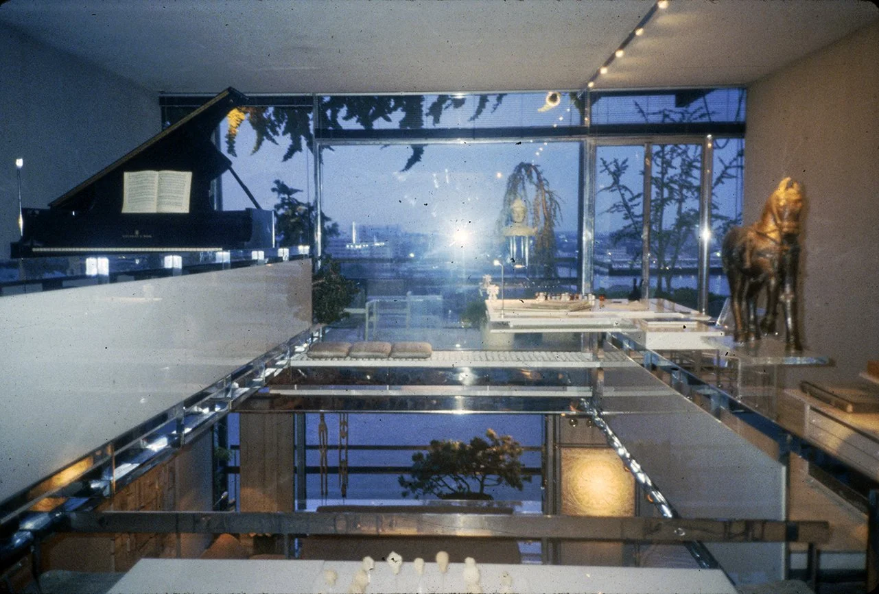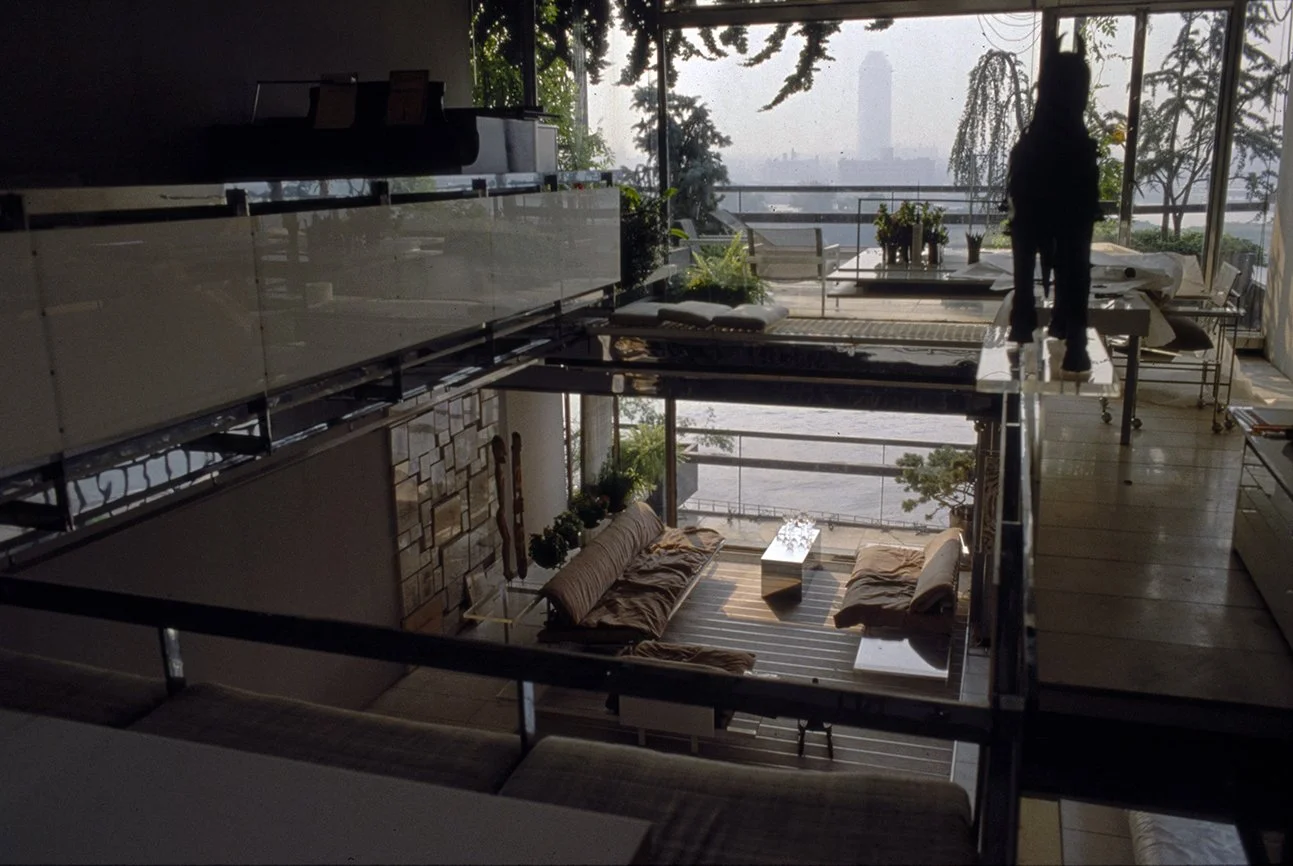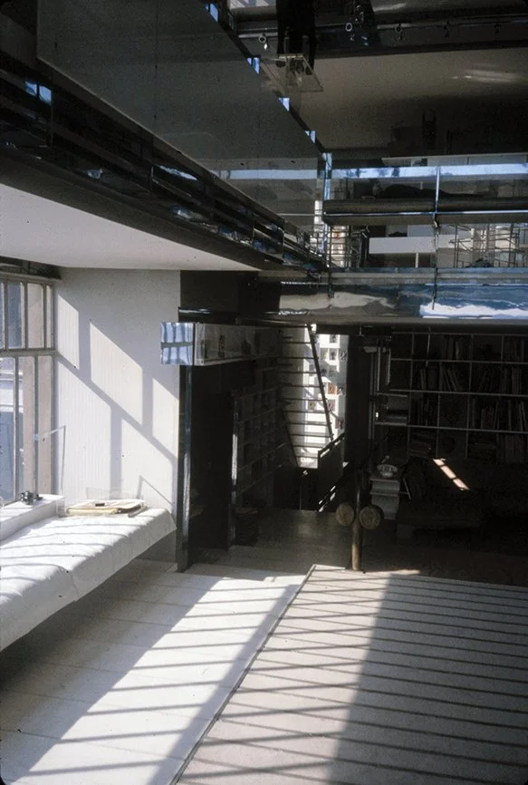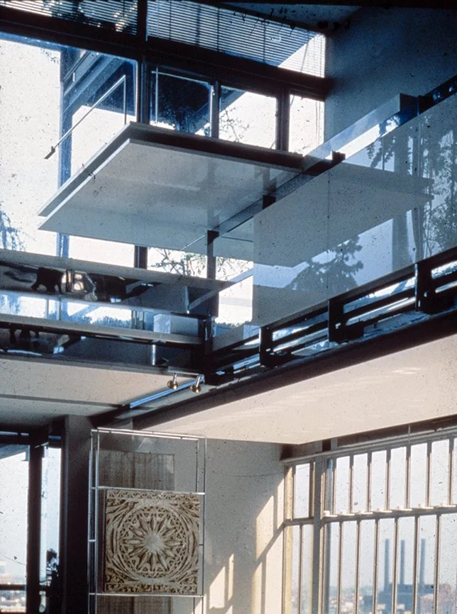 The Boyds transform Rudolph's penthouse plus the floors below it into a house museum to display their collection of 20th-century Modern furniture and artworks. The Boyds also make changes to Rudolph’s original interiors: they strip off chromed laminate applied to steel beams and columns to match the stainless steel in the floor, they put Sheetrock under the Plexiglas tub hanging above the entry and part of the kitchen. To keep visitors (and residents) from suffering vertigo, they partially enclose the sides of the floating stairs with vertical white-frosted-acrylic panels, and replace the clear acrylic floors of the bridges with a translucent version. Many of the reflective and transparent planes and lines disappear into the new, stark white interior.