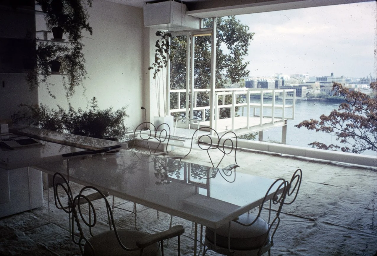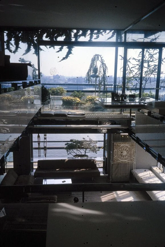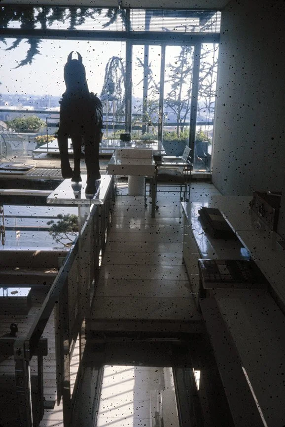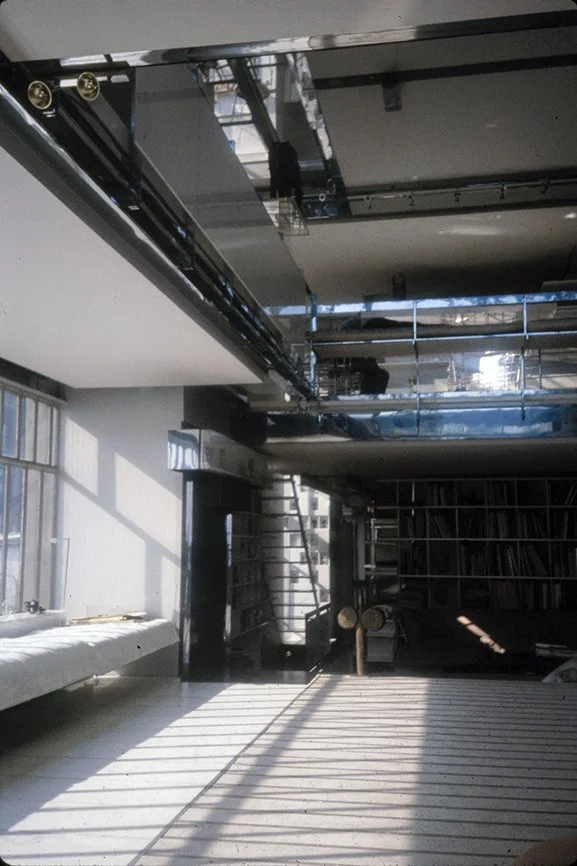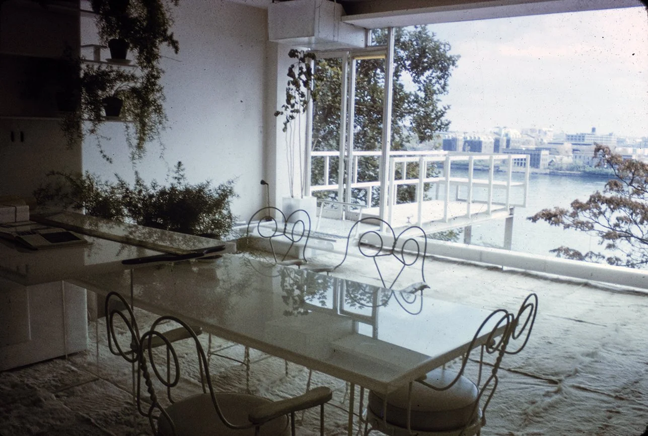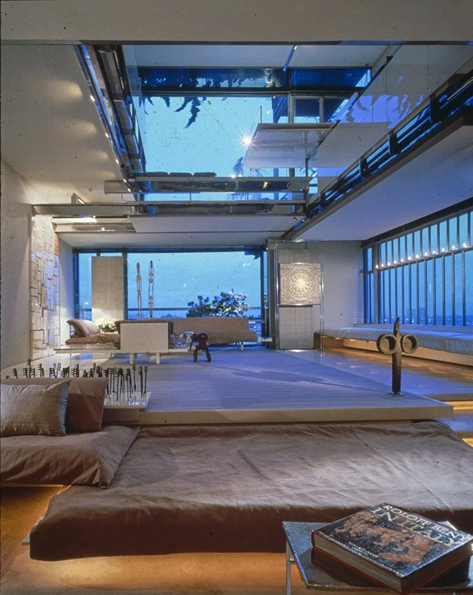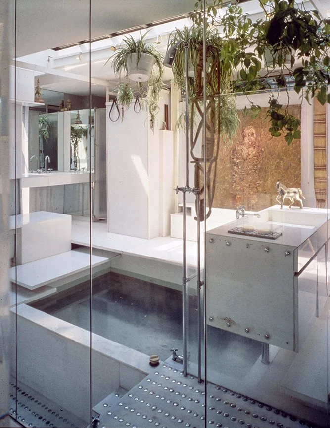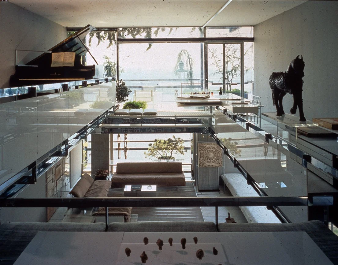 The Boyds transform Rudolph's penthouse plus the floors below it into a house museum to display their collection of 20th-century Modern furniture and artworks. The Boyds also make changes to Rudolph’s original interiors: they strip off chromed laminate applied to steel beams and columns to match the stainless steel in the floor, they put Sheetrock under the Plexiglas tub hanging above the entry and part of the kitchen. To keep visitors (and residents) from suffering vertigo, they partially enclose the sides of the floating stairs with vertical white-frosted-acrylic panels, and replace the clear acrylic floors of the bridges with a translucent version. Many of the reflective and transparent planes and lines disappear into the new, stark white interior.