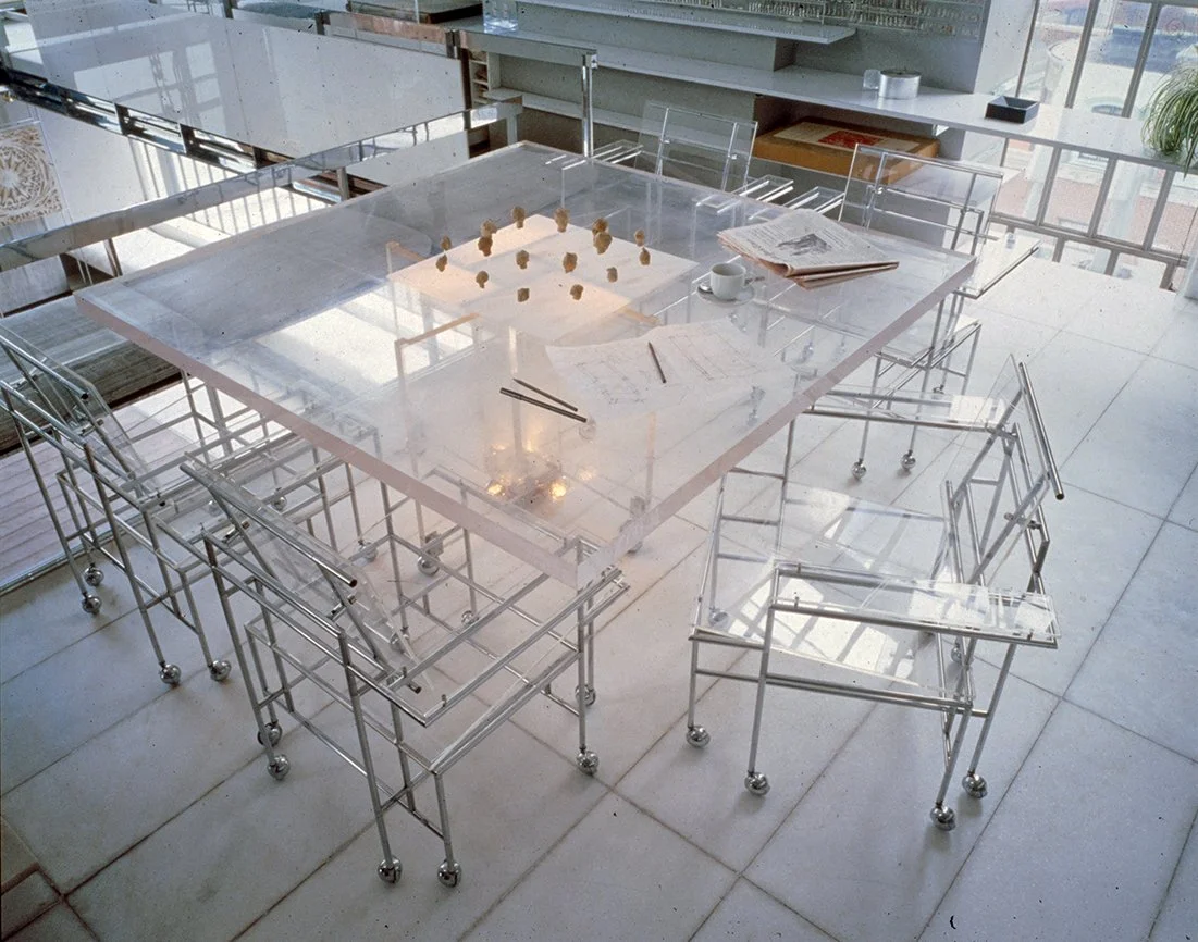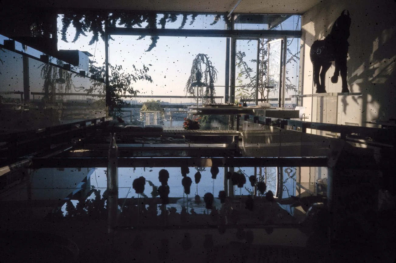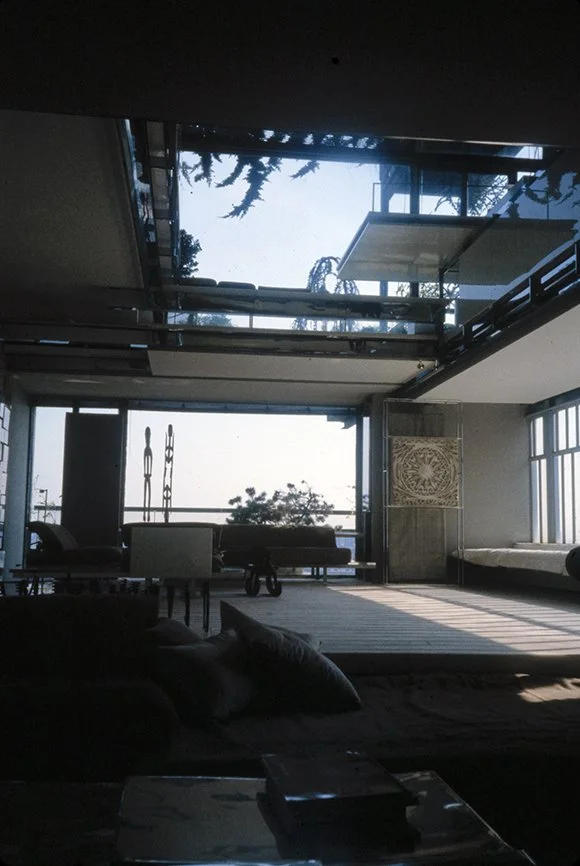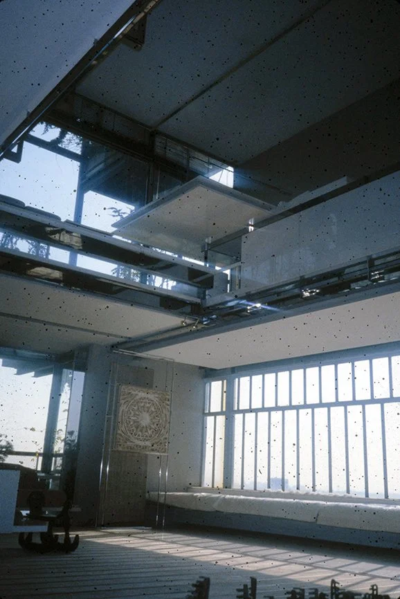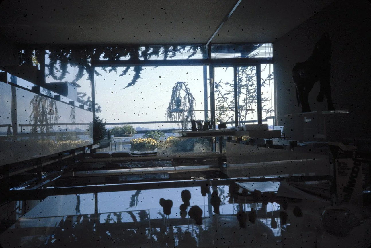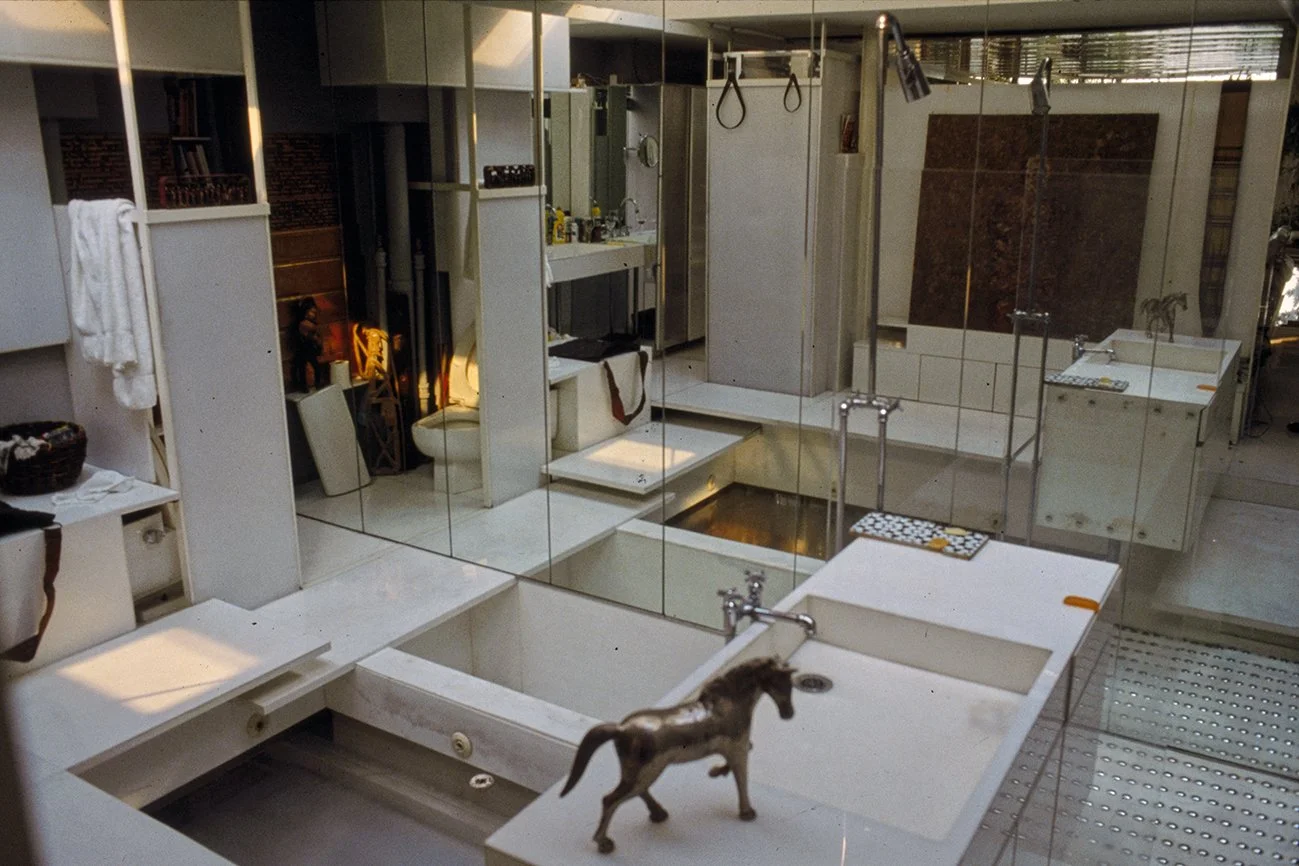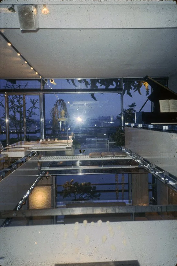 The Boyds transform Rudolph's penthouse plus the floors below it into a house museum to display their collection of 20th-century Modern furniture and artworks. The Boyds also make changes to Rudolph’s original interiors: they strip off chromed laminate applied to steel beams and columns to match the stainless steel in the floor, they put Sheetrock under the Plexiglas tub hanging above the entry and part of the kitchen. To keep visitors (and residents) from suffering vertigo, they partially enclose the sides of the floating stairs with vertical white-frosted-acrylic panels, and replace the clear acrylic floors of the bridges with a translucent version. Many of the reflective and transparent planes and lines disappear into the new, stark white interior.