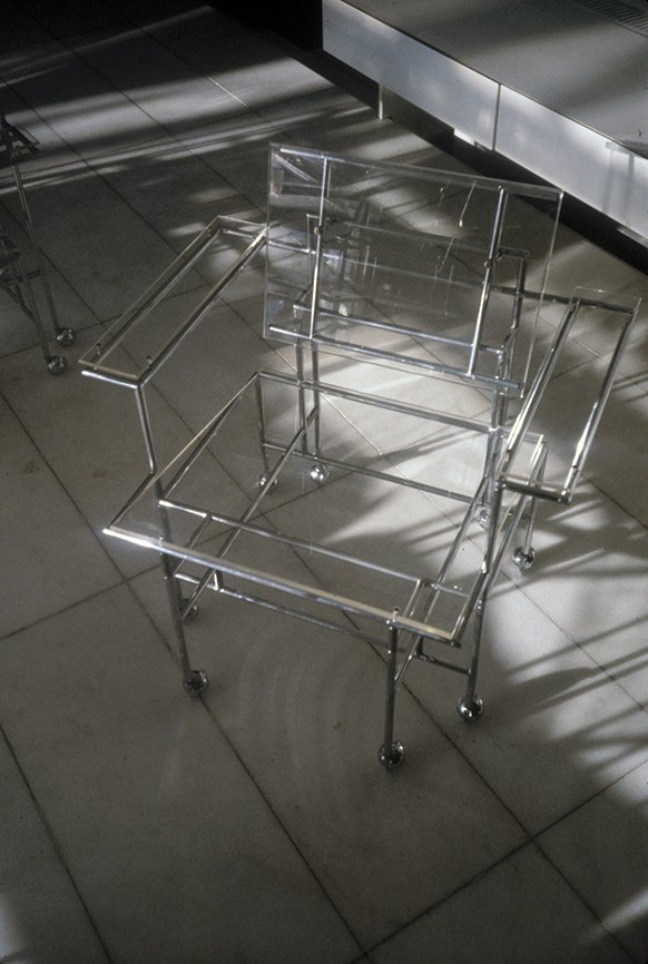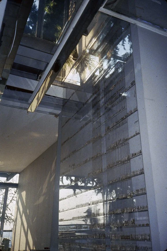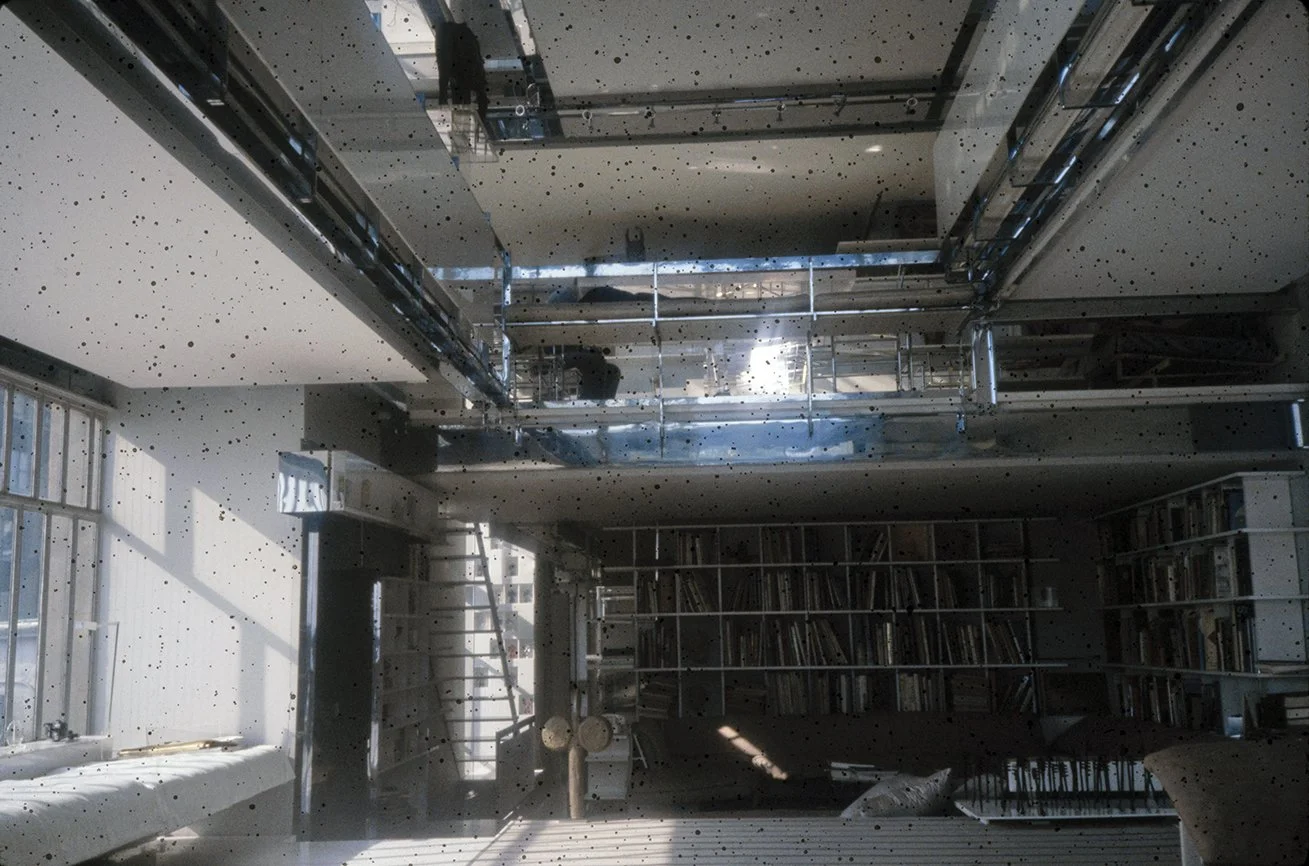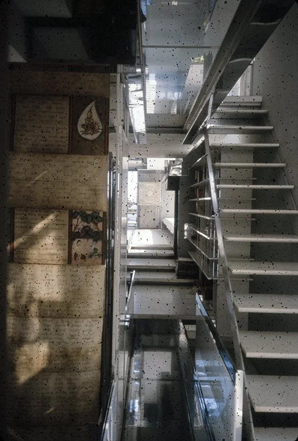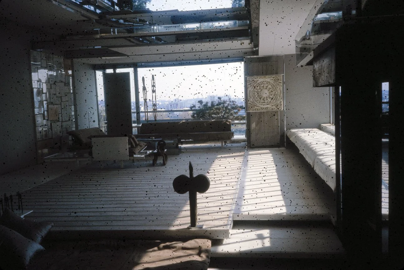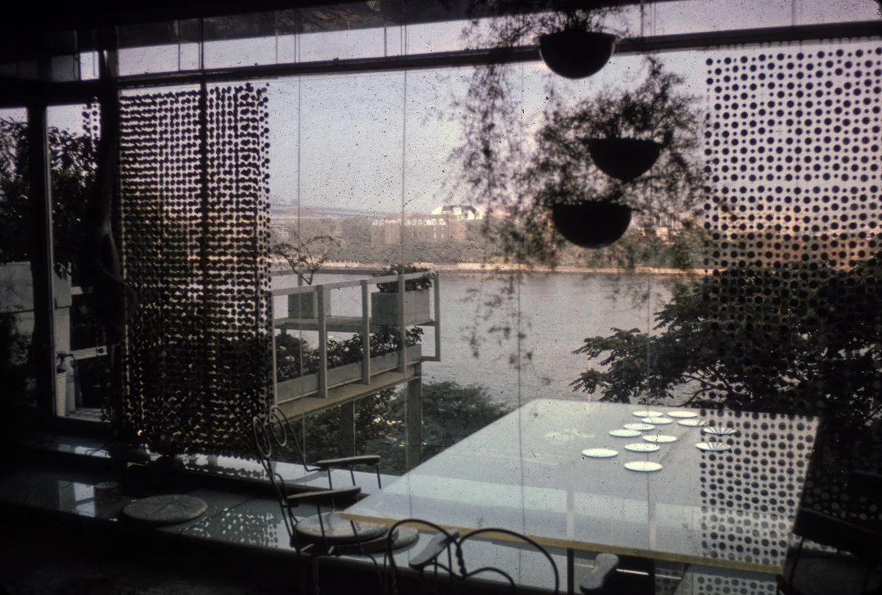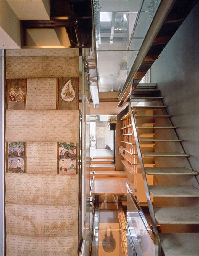 The Boyds transform Rudolph's penthouse plus the floors below it into a house museum to display their collection of 20th-century Modern furniture and artworks. The Boyds also make changes to Rudolph’s original interiors: they strip off chromed laminate applied to steel beams and columns to match the stainless steel in the floor, they put Sheetrock under the Plexiglas tub hanging above the entry and part of the kitchen. To keep visitors (and residents) from suffering vertigo, they partially enclose the sides of the floating stairs with vertical white-frosted-acrylic panels, and replace the clear acrylic floors of the bridges with a translucent version. Many of the reflective and transparent planes and lines disappear into the new, stark white interior.