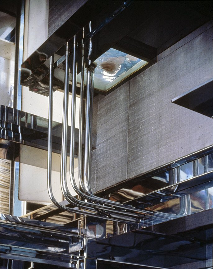 A lot of Rudolph’s original design had been lost already, including finishes that had not aged well, such as carpeting, Sheetrock, and melamine. The architects bring in Joe Ginsberg, Inc. to provide items such as mirror-finished stainless steel and acid-etched, brushed, and sandblasted glass, as well as new details, such as hardware. Ginsberg uses finishes that resemble Rudolph's original choices; for example, the company gives the new wood cabinetry a varnish coating that recreates the look of melamine. Where the owner wants to keep the stainless-steel plates on the floors in the guest bedroom and media room, Ginsberg matches the aging stainless with a version that won’t appear jarringly brand-new. The architects keep the translucent acrylic bridges from the previous renovation, because the client wants to avoid the expense of going back to clear acrylic. Della Valle Bernheimer removes Rudolph’s personal elevator and seals the shaft with clear acrylic to create a transparent light well running vertically through the apartment. The architects raise Rudolph's low seating areas that nearly sat on the floor. Instead of carpeting, they install an epoxy surface with a sheen echoing the waters of the East River outside. To fend off vertigo, the architects substitute vertical screens of parallel stainless-steel cables with rivets along the edges of stair treads (not unlike Rudolph had used on some of his residential projects), which are more transparent than the vertical louvers enclosing the stairs in the Boyd renovation. Clear glass panels form the mezzanine balustrade instead of the white, frosted acrylic used by the Boyds, or the gleaming acrylic used by Rudolph. Other changes involve reconfiguring the kitchen and redoing the bathrooms with new plumbing and electrical fixtures, along with solid-surface counters and cabinets. The master bath is enlarged, although the owner keeps it in the same location. For the façade, the architects discover structural beams in the cantilevered portion over Beekman Place are sagging, so new steel in inserted within the webs of the I-beams and re-weld them to shore up Rudolph’s addition. Steel framing members are also replaced on the rear façade of the building, facing the East River. When finally complete, the construction takes 20 months.