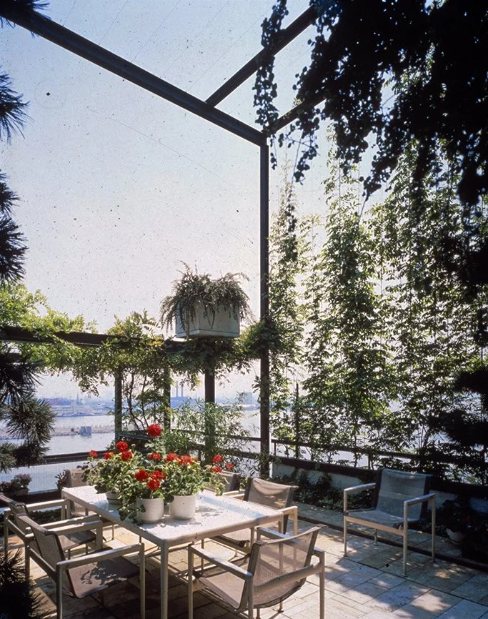 “The rooftop at Beekman Place enjoys its place in the sun, partially because a zone of space created by steel columns and beams supporting wisteria on trellises protects the inner space. This intermediate zone acts as a buffer between the interior spaces, the noisy city close by, and the brilliant sun overhead.”